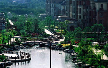 桂花公寓系列交通组织实行组团人车分流,车行布置于外围,或者直接从主入口进入地下车库;组团内为步行系统,仅设置消防车道。桂花公寓系列活动休闲场地沿绿化带散布其中,营造富有活力的社区核心公共空间。会所的室外泳池和庭院景观,结合小区中心公共绿地设计,将人的活动融于其中。